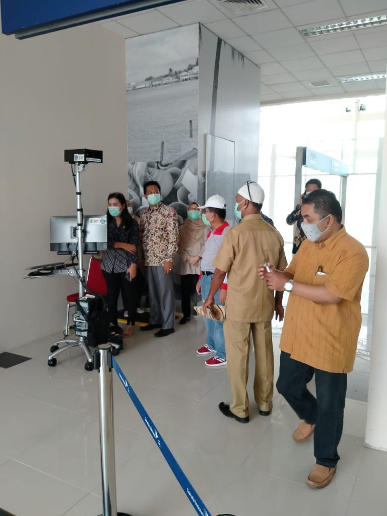 Dari simulasi penumpang yang baru datang dan hendak berangkat harus melewati alat thermo scanner dan disemprot desinfektan. Bagi yang suhu tubuhnya tinggi akan dikarantina untuk dilakukan pengecekan lebih lanjut.