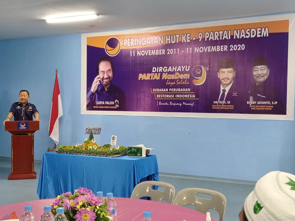 DPD Partai NasDem Kota Tanjungpinang memperingati HUT ke 9 Partai NasDem dengan sederhana namun penuh kebersamaan. Sesuai instruksi dari DPP Partai NasDem tentang arahan pelaksanaan peringatan HUT ke 9 tahun 2020, DPD NasDem Tanjungpinang menyelenggarakan doa bersama dan pemotongan tumpeng sebagai wujud rasa syukur atas pencapaian partai ini hingga berusia sebelas tahun, Rabu, 11 November 2020.